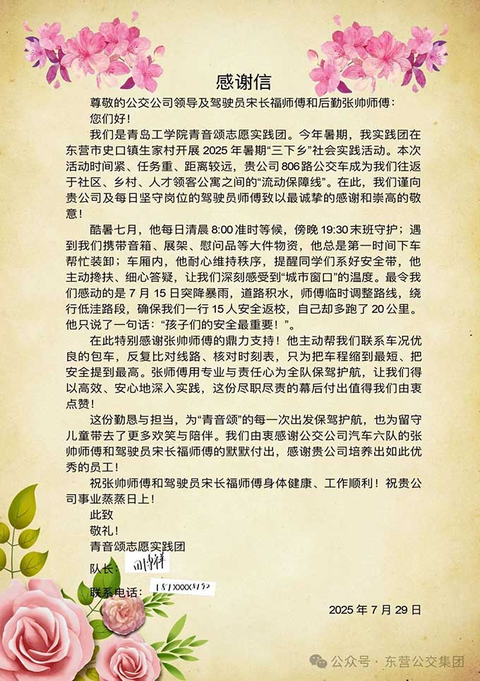 近日,青島工學(xué)院青音頌志愿團發(fā)來一封感謝信,感謝東營市公交集團駕駛員宋長福師傅熱情服務(wù)。原來,在今年...